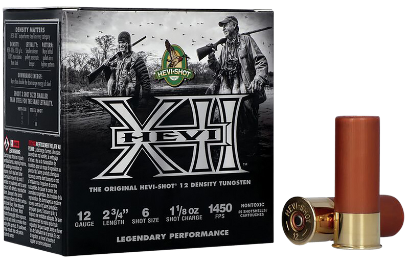 HEVI-XII shotshells feature tungsten pellets at 12 density, allowing you to drop down three shot sizes compared to steel for equivalent lethality with 28% more pellets in the air. Loaded to 1450 fps in a 2.75" plastic case with #6 shot, these are designed for waterfowl hunting. High brass construction provides reliable ignition and consistent performance.