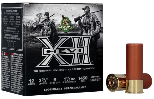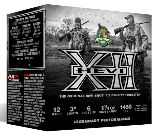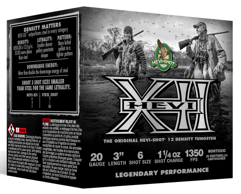 HEVI-Shot HEVI-XII 20 gauge 3" shotshells deliver 1 1/4oz of tungsten #6 shot at 1350-1500 fps, designed for waterfowl hunting. These non-toxic loads provide 28% more tungsten pellets on target compared to steel shot of the same size, offering superior lethality for hunting applications.