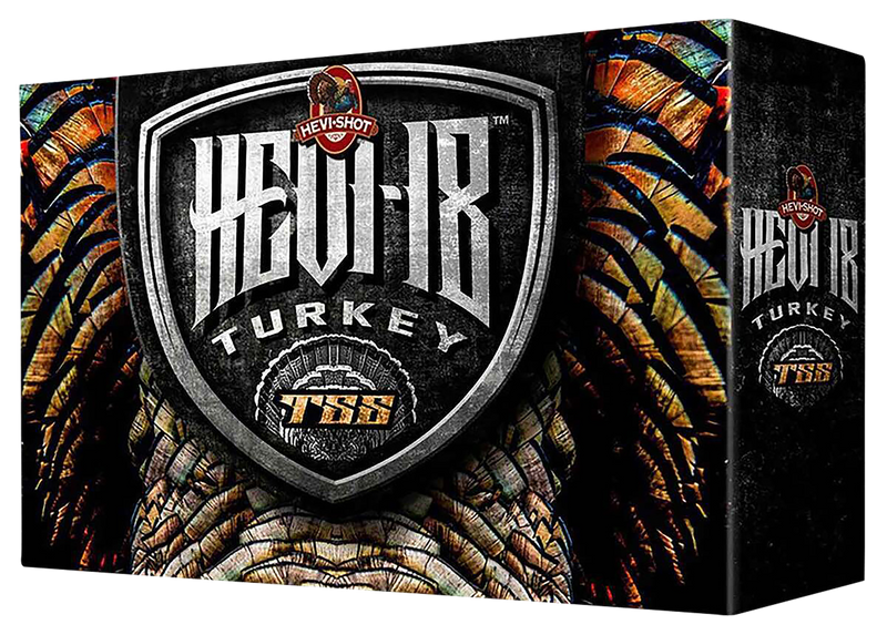 HEVI-Shot HEVI-18 TSS Turkey shotshells in 28 gauge with 3" cases and 1.25oz of tungsten pellets. Features a three-shot-size blend (#5, #6, #7) designed for turkey hunting with extended effective range up to 66 yards. Loads approximately 437 pellets per shell with 1300 fps velocity and are packaged 5 rounds per box.