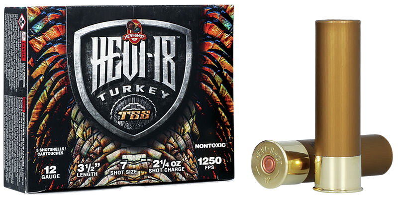 HEVI-Shot HEVI-18 TSS Turkey shotshells in 12 gauge 3.5" magnum with 2.25 oz of #7 tungsten shot at 1250 fps. Ultra-dense tungsten pellets deliver superior downrange performance for turkey hunting with tight patterns and maximum lethality.