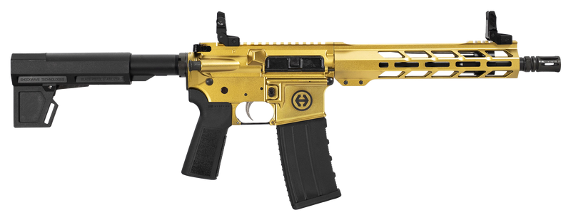 Hi-Point HP-15 semi-automatic pistol in 5.56 NATO with a 10.5" threaded barrel and 30+1 round capacity. Features a gold aluminum receiver, M-LOK handguard, blade-style polymer brace, UTG flip-up sights, and A2 birdcage flash hider. Weighs 4.25 lbs with an overall length of 26.25".