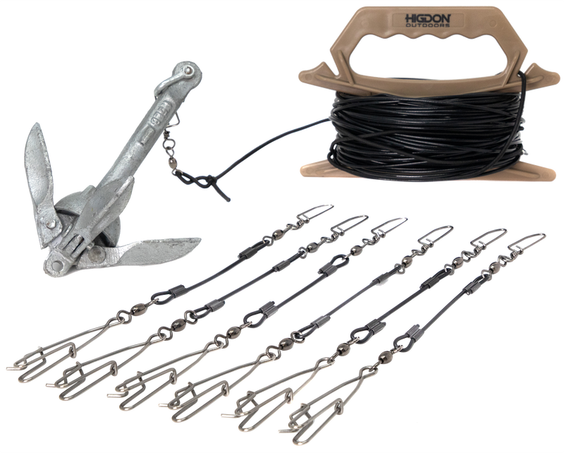 The Higdon Outdoors Battleship Jerk Rig is a 125-foot PVC coated steel cable system that creates natural swimming, feeding, and bobbing motion for floating decoys without batteries or wires. It includes rust-free quick-connect decoy clips, a poly handle, 1.5 lb. grapnel anchor, and six quick-connect decoy clips for easy setup and operation.