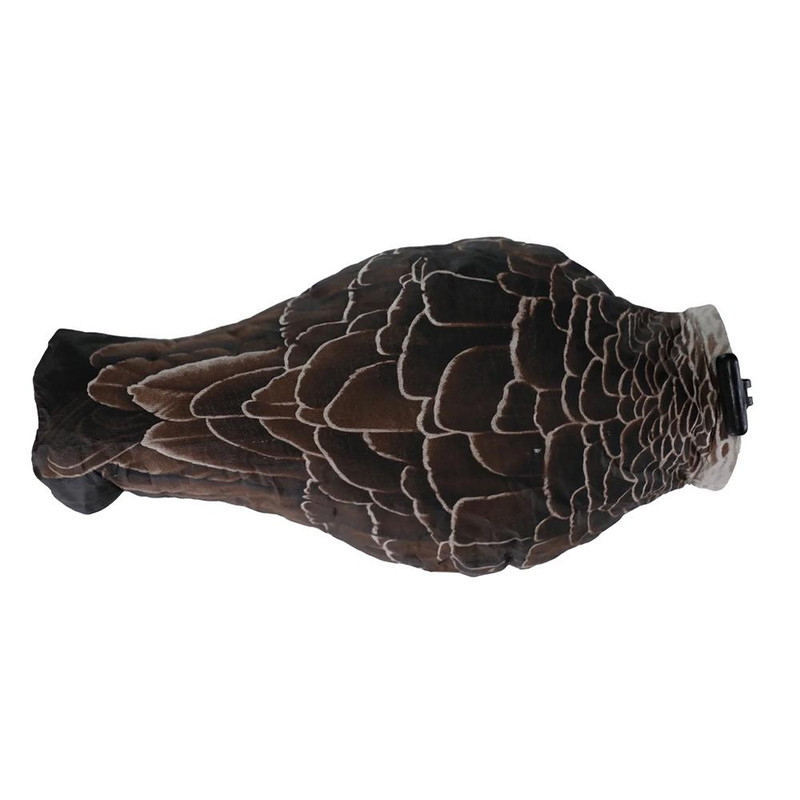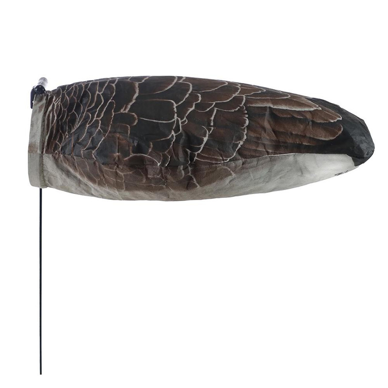 Sock-style decoys featuring a one-handed deployment mechanism with durable Tyvek material and detailed artwork. Includes steel stakes and oversized handles for easy setup and retrieval. Pack of 12 decoys designed for Canadian geese hunting.