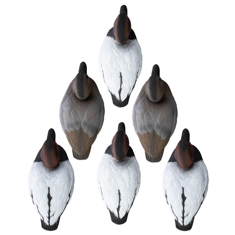 Pack of 6 foam-filled Canvasback duck decoys designed for diving duck hunters. Features high visibility coloring, multiple body postures, and durable foam construction that won't be damaged by stray shot. Space-efficient design suitable for any waterfowl spread.