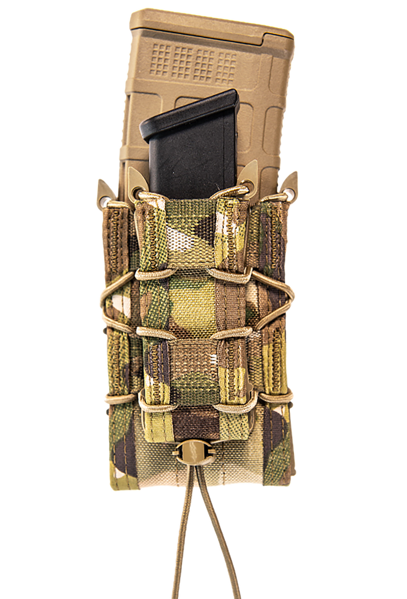 The High Speed Gear Double Decker TACO is a dual-compartment magazine pouch designed to carry one rifle magazine and one pistol magazine simultaneously. Constructed from hybrid Kydex and Nylon with MOLLE mounting compatibility, it provides secure retention for mixed magazine types. Available in MultiCam with dimensions of 9.1" L x 4.1" W x 3.5" H.