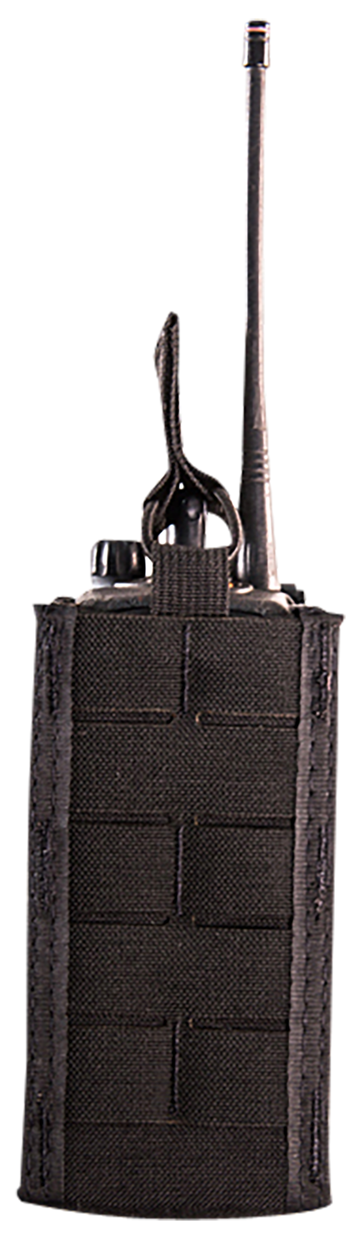 This High Speed Gear TACO Duty pouch is designed to securely carry a single handheld radio or similar communications device. Constructed from durable black nylon with a MOLLE exterior, it mounts to MOLLE systems or 2" belts via belt clip attachment. The pouch measures 10.5" L x 4.6" W x 2.8" H and features a single compartment for organized storage.