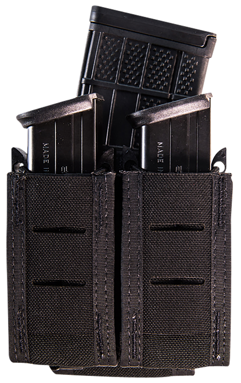 The TACO Duty Double is a versatile magazine pouch designed to hold 2 pistol magazines and 1 rifle magazine in a single 3-compartment unit. Constructed from durable black nylon with a MOLLE exterior, it mounts securely to MOLLE panels or 2-inch duty belts. Compact dimensions (11.0" L x 4.2" W x 2.8" H) make it ideal for tactical loadouts and professional use.