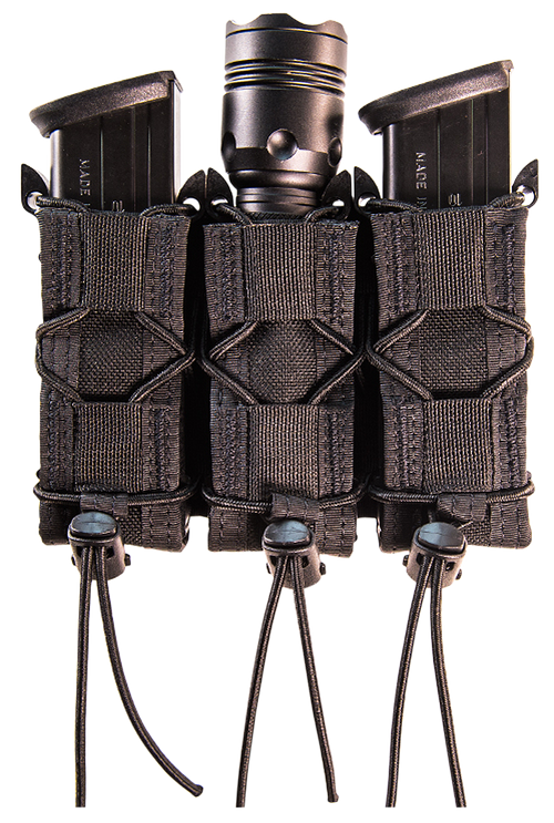 This is a modular magazine pouch system designed for law enforcement and tactical use with MOLLE compatibility. The open-top cuff case features a pistol taco attachment for secure magazine retention and quick access. Constructed for durability and versatility in duty and training environments.