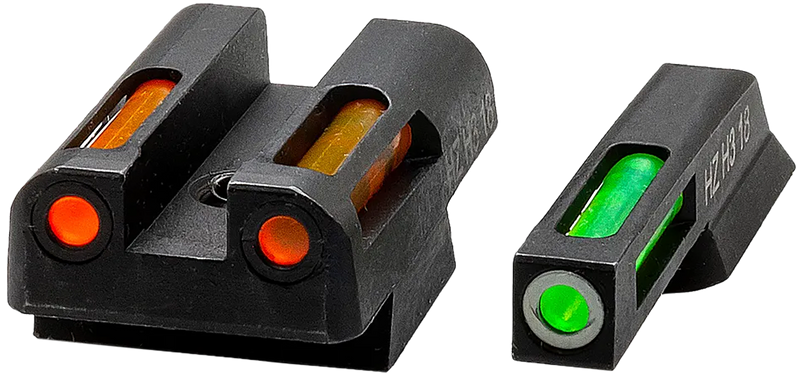 This hybrid tritium and fiber-optic night sight set is designed for CZ 75, 85, and P-01 handguns. Features a green tritium front sight with white outline ring and orange rear sight with litepipes for enhanced visibility in low-light conditions. Steel construction provides durability for duty and sport shooting applications.