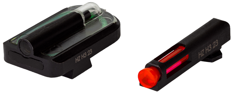 The Hi-Viz FastDot H3 is a low-profile night sight set combining fiber optic and tritium technology for 24-hour illumination in all light conditions. Features a red fiber optic front sight with green tritium rear sight, designed to fit all Glock pistols in 9mm, .40 S&W, and .357 Sig calibers. All-steel construction with patented technology fits standard holsters and includes a 12-year manufacturer warranty on tritium lamps.