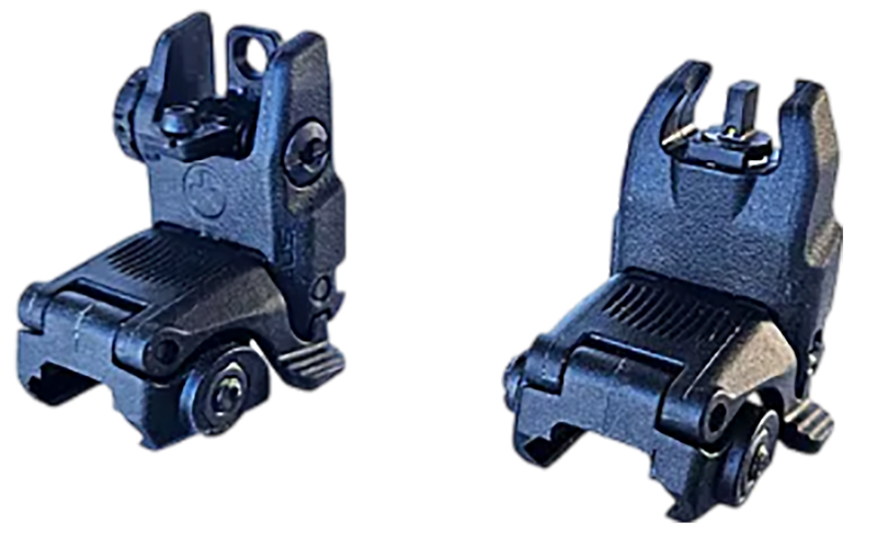 Folding front and rear backup iron sight designed for AR-15 platforms with Picatinny rail compatibility. Features green tritium front post for low-light visibility and adjustable sight picture. Compact folding design stows flat when not in use.
