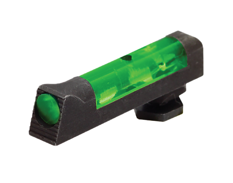 Hi-Viz fiber optic front sight designed for all Glock pistol models. Features a green fiber optic element with a fixed front sight design and black steel frame for enhanced accuracy and target acquisition.