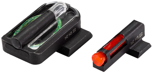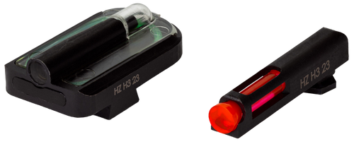 This Hi-Viz FastDot H3 sight set features a red fiber optic front sight paired with a green tritium rear sight, designed specifically for Smith & Wesson M&P, Shield, and Shield Plus pistols. The fiber optic front sight gathers ambient light for a bright aiming point, while the tritium rear sight provides low-light visibility. The steel construction with black frame ensures durability and reliable performance in various shooting conditions.