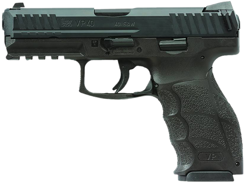 The HK VP40 is a striker-fired semi-automatic pistol chambered in 40 S&W with a 4.09" barrel and 10+1 capacity. Features include a black polymer frame with Picatinny rail, serrated steel slide with black Cerakote finish, interchangeable backstrap grips, and night sights. This compact duty pistol weighs 26.56 oz and offers ambidextrous controls for enhanced ergonomics.