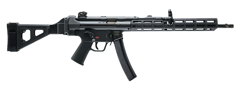 The HK SP5L is a semi-auto rifle chambered in 9mm Luger with a 16.5" barrel and 10+1 capacity, featuring roller-delayed blowback operation and a tri-lug mount. It comes equipped with an SB Tactical brace, M-LOK handguard, adjustable rear diopter sights, and a threaded barrel. This aluminum-receiver platform weighs 5.1 lbs and ships with a soft case and two 10-round magazines.