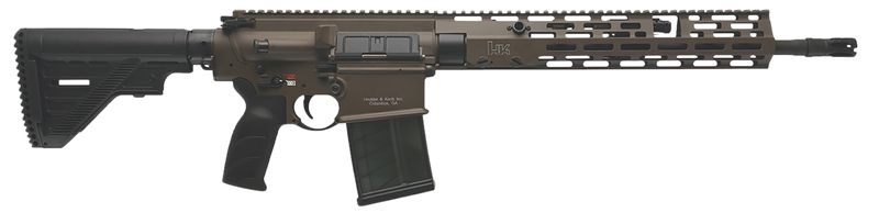 The HK MR762 A4 is a 7.62x51mm NATO semi-automatic rifle with a 16.5" threaded barrel and 20+1 capacity. Features include a two-stage trigger, ambidextrous controls, Picatinny rail receiver, M-LOK handguard, and 6-position adjustable synthetic stock. Weighs 9.84 lbs with an overall length of 39.5".