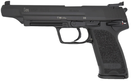 The HK USP45 Elite is a .45 ACP double-action/single-action (DA/SA) pistol with a 6.02" barrel and safety/decocking lever mounted on the left side. It ships with two 10-round magazines and is designed for target shooting and defensive applications.