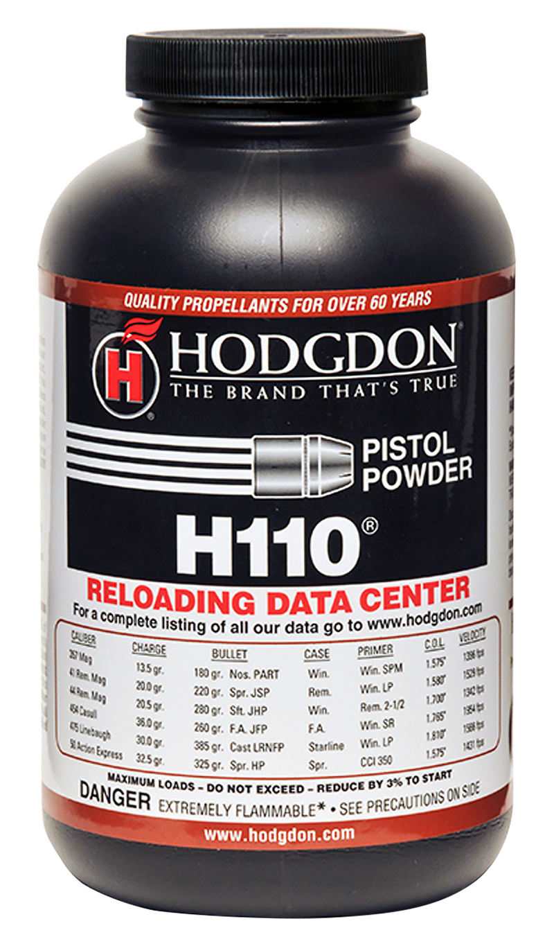 H110 is a spherical smokeless powder designed for handgun and shotgun reloading across multiple calibers. It delivers high velocities with excellent accuracy, particularly in magnum pistol cartridges like .44 Magnum, .454 Casull, and .460/.500 S&W, as well as .410-bore shotgun loads. The powder is suitable for competitive shooting applications including silhouette and skeet shooting.