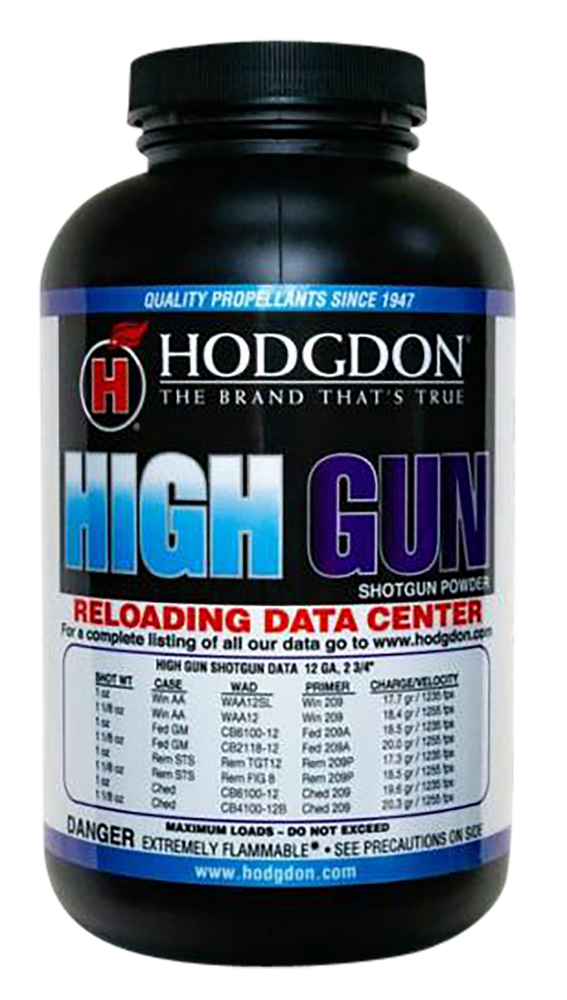 High Gun is a flattened spherical shotshell powder designed for light-target, handicap, and super handicap loads in 12-gauge shotguns, closely duplicating Remington Nitro 27 factory loads. The powder meters consistently, provides excellent ignition, and burns clean enough to produce uniform shot patterns. Available in 1 lb cans.