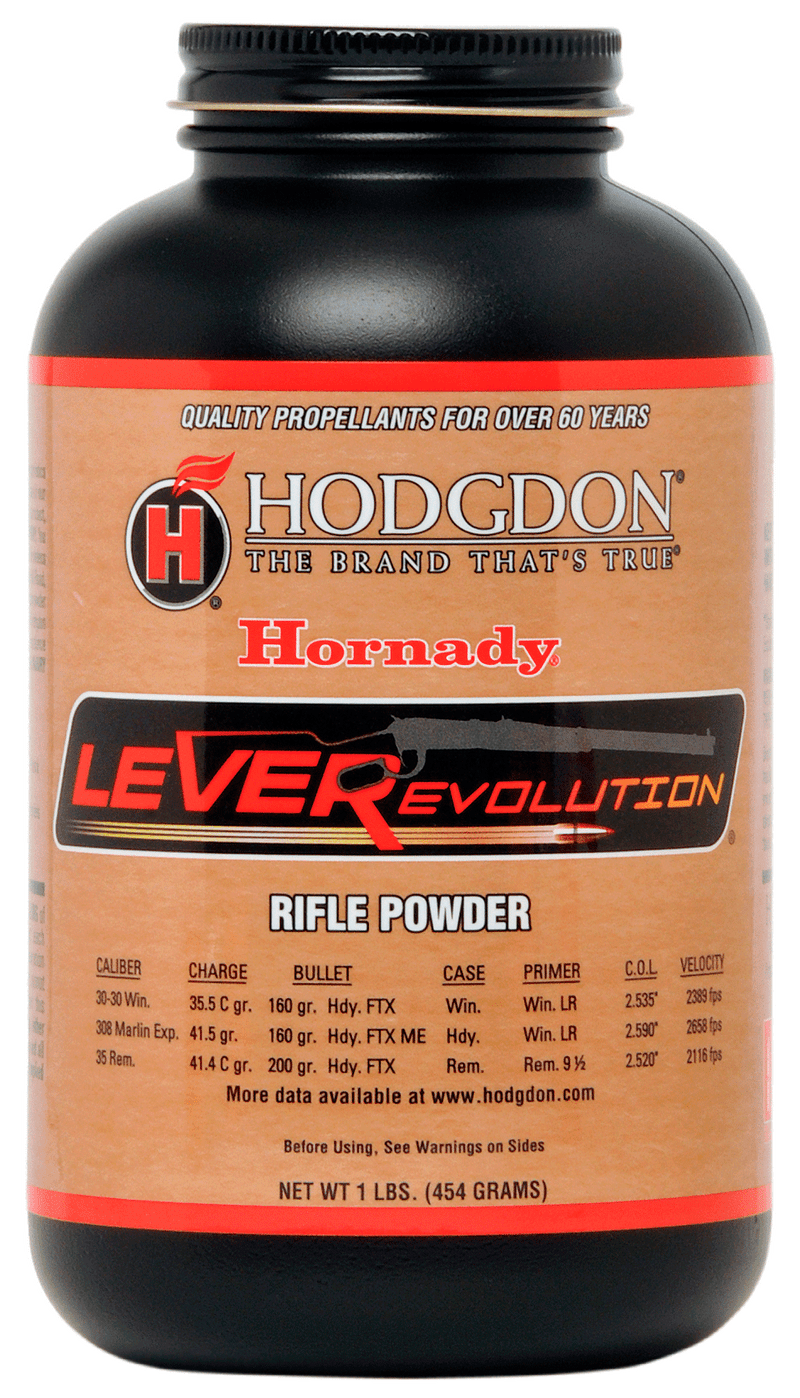 Hodgdon LEVERevolution is a spherical rifle powder designed for lever-action cartridges, particularly the .30-30 Winchester, .25-35 Winchester, and .308 Marlin Express. It delivers velocities exceeding 100 feet per second over standard loads and meters with exceptional precision. This powder is the same propellant used in Hornady's high-performance factory ammunition.