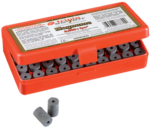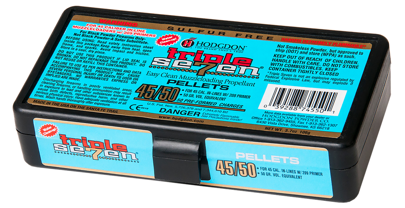 Hodgdon Triple Seven Pellets are black powder substitute pellets designed for .45 caliber muzzleloading rifles, delivering 50 grains of propellant per pellet. These pellets offer instant ignition, consistent performance, and easy cleanup compared to loose powder. Available in 50-piece boxes with 12 boxes per case.