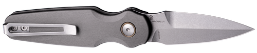 The Hogue Ballista-II features a 2.6-inch blade with automatic deployment and bayonet-style design, constructed with aluminum handles in black finish. This knife combines tactical functionality with reliable automatic opening mechanism. Dimensions are 6.5 inches in overall length when open.