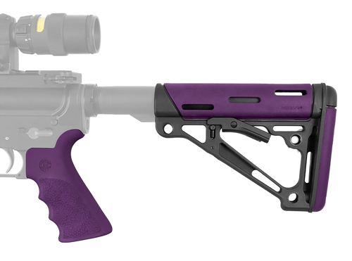 This Hogue OverMolded 2-piece stock kit is designed for AR-15 and M16 rifles with mil-spec tubes (tube not included). The kit features a collapsible design with 6 positions of adjustment and combines black and aqua rubber/polymer construction for ergonomic grip and durability. Installation is straightforward onto a standard mil-spec buffer tube.