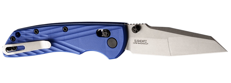 The Hogue Deka is a 3.25" folding knife featuring a modified Wharncliffe blade made from CPM MagnaCut steel with a stone tumbled finish. It has a blue textured polyamide nylon handle with an Able Lock mechanism and thumb stud opener, offering a compact 7.5" overall length when open.