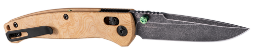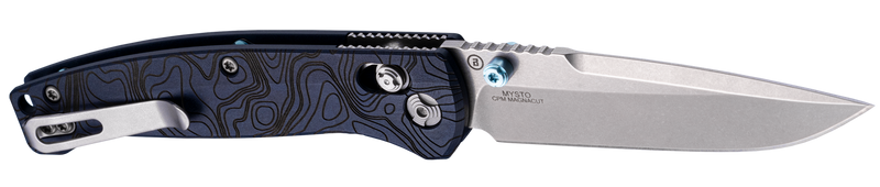 The Hogue Mysto is a 3.40" folding knife featuring a clip point blade made from CPM MagnaCut steel with a plain edge and black stonewashed finish. It has a thumb stud opening mechanism and a Maple Valley Richlite blue handle, with an overall length of 7.80" when open and weighing 2.50 oz.