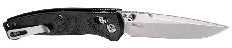 The Hogue Mysto is a 3.4" folding clip point knife featuring a CPM MagnaCut steel blade with stonewashed finish and a black Richlite handle with thumb stud opening. It includes an ABLE lock mechanism, titanium backspacer, and a lanyard hole, with an overall length of 7.8" when open.