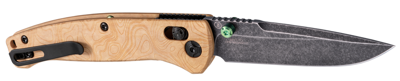 The Hogue Mysto is a 3.40" clip point folding knife featuring a CPM MagnaCut steel blade with a black stonewashed finish and thumb stud opening mechanism. The handle is constructed from Maple Valley Richlite wood with a titanium backspacer and includes an ABLE lock mechanism and lanyard hole for secure carry.