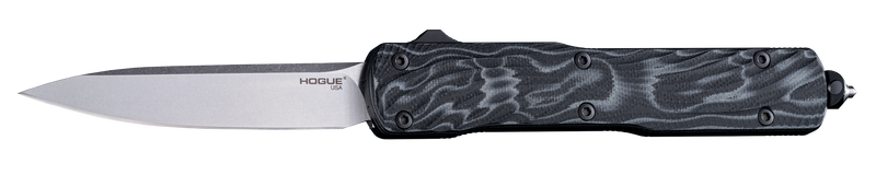 The Hogue Counterstrike is a 3.35" OTF (out-the-front) automatic knife featuring a drop point blade made from CPM 20V stainless steel with a stone tumbled finish. The knife has an overall length of 8.35" and weighs 2.90 oz, with a black G-Mascus aluminum and G10 handle construction. It includes a carbide glass breaker and hand-sharpened edge.