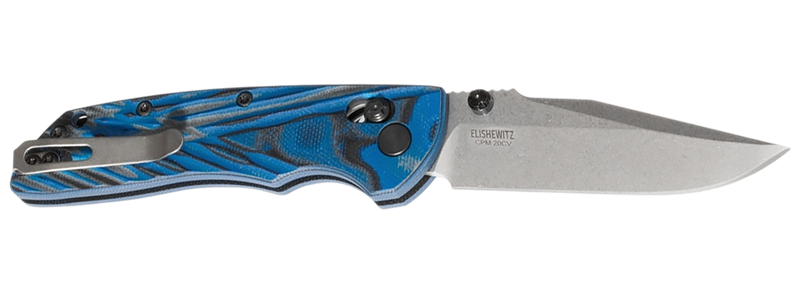 The Hogue Deka is a mid-size folding knife featuring a 3.25" CPM 20CV clip point blade with stone tumbled finish and ambidextrous ABLE lock mechanism. The knife has a blue G-10 handle with G-Mascus aluminum accents, stainless steel ambidextrous pocket clip, and lanyard hole. Overall length is 7.5" when open and weighs 2.3 oz.