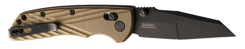 The Hogue Deka is a 3.25" folding knife featuring a CPM MagnaCut stainless steel blade with a modified Wharncliffe edge and black Cerakote finish. The handle is constructed from flat dark earth (FDE) polyamide nylon with crosshatch texturing and includes a pocket clip for convenient carry. This knife employs an Able Lock mechanism and thumb stud opening.