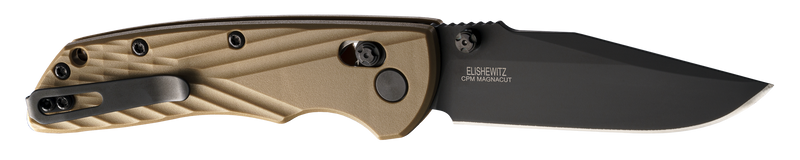 The Hogue Deka is a 3.25" folding knife featuring a CPM MagnaCut stainless steel clip point blade with black Cerakote finish and ambidextrous thumb studs for manual opening. The handle is constructed from glass-reinforced nylon with flat dark earth (FDE) crosshatch texturing and includes a pocket clip. This American-made folder weighs 2.1 oz and uses an Able Lock mechanism to secure the blade during use.