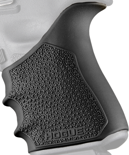 The Hogue HandAll Beavertail Grip Sleeve is a rubber grip cover designed for Glock 19, 23, 32, and 38 pistols in Gen 3-4 models. It features a beavertail design that extends up the backstrap for improved ergonomics and control. The sleeve simply slides over the existing grip without tools or permanent modification.