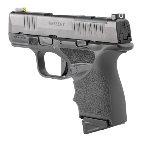 Precision-fit rubber grip sleeve designed specifically for the Springfield Armory Hellcat with cobblestone texture for enhanced control. Features gentle palm swells and finger grooves that naturally position fingers for optimal grip comfort and handling. Installation is direct slip-on with no tools required.