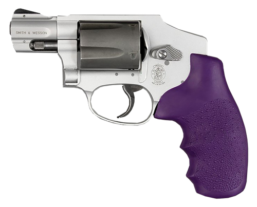 Single-piece rubber grip designed for S&W J Frame revolvers with round butt frames. Features finger grooves, ambidextrous palm swells, and a patented steel stirrup device that installs without firearm modification. The high handhold on the backstrap reduces muzzle rise and improves rapid-fire recovery.