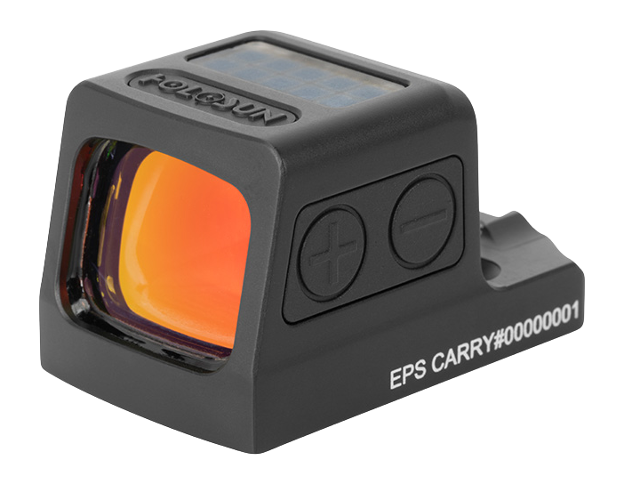 The Holosun EPS Carry is a compact enclosed pistol red dot sight featuring a 2 MOA dot with 32 MOA circle reticle. It offers 1x magnification with solar and battery illumination, making it ideal for carry pistols and concealed weapon applications. The anodized black finish provides durability in a slim-line design.