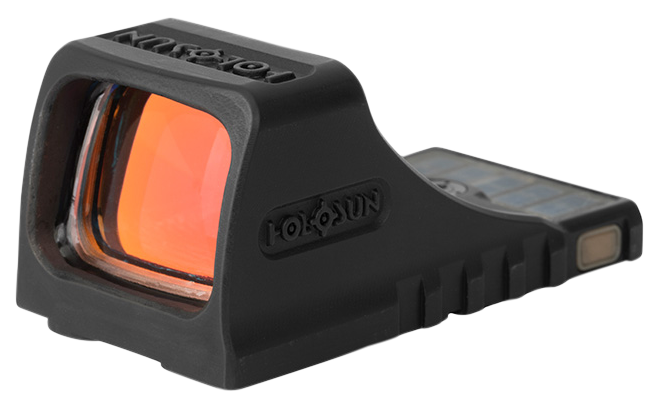 The Holosun SCS is a 1x fixed magnification red dot sight designed for Glock MOS pistols, featuring a multi-reticle system with a 2 MOA green dot and 32 MOA circle. The sight includes solar charging with an internal battery backup, unlimited eye relief, and is fully waterproof rated. It features 1 MOA windage and elevation adjustments with multi-coated optics for optimal light transmission.