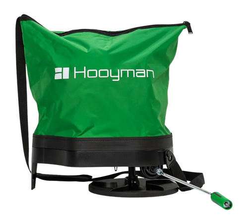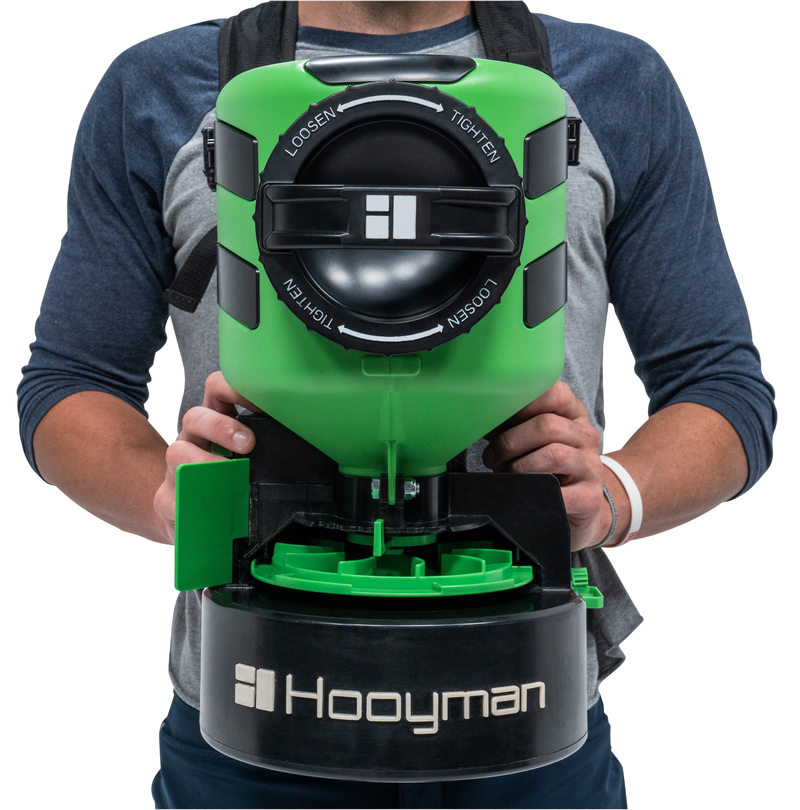 The Hooyman 24V Lithium-Ion Chest Spreader is a directional feed spreader designed for wildlife feeding with adjustable throttle control for variable spread rates. It features a proprietary throwing disc for maximized throwing distance and even spread pattern, with a 35 lb capacity and 3-hour continuous runtime per charge. Includes harness, battery, and charger.
