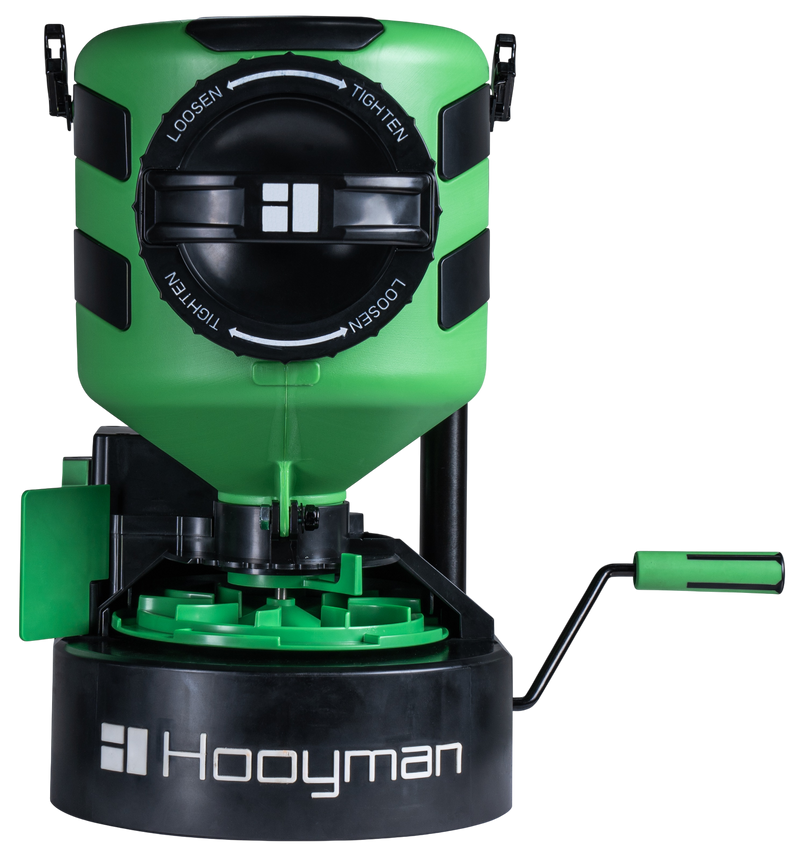 A manual hand-crank spreader designed for year-round land management and feed distribution. Features a 35 lb capacity hopper with adjustable feed gate for throwing clover, corn, fertilizer, or salt granules up to 20 feet, and an adjustable harness system for comfortable wear. The no-slip H-grip handle and proprietary throwing disc enable even, controlled spreading.