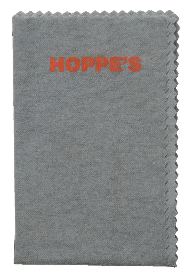 Hoppe's silicone-treated flannel cleaning cloth designed for firearms and fishing reels. The cloth is pretreated with lubricant to remove fingerprints and corrosive oils while providing a protective coating against rust and corrosion. Each pack contains 10 cloths measuring approximately 11" x 14".