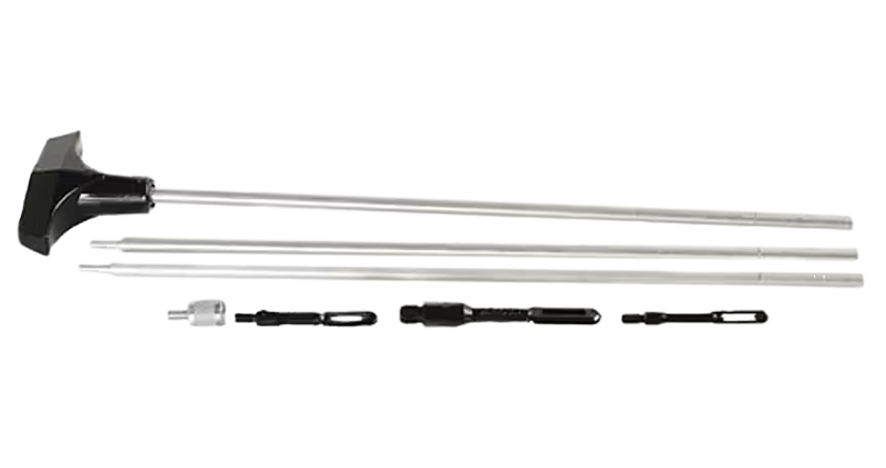 This 3-piece stainless steel bench rest cleaning rod is designed for universal use across all rifle and shotgun calibers and gauges. The set includes a shotgun adapter and features slotted tips for effective bore cleaning. Dimensions are approximately 15.4 inches in length with a durable stainless steel construction suitable for long-term use.