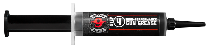 Hoppe's Black Gun Grease is a synthetic polymer lubricant designed to protect firearms against rust, heat, friction, and wear in extreme conditions. The product features an operating temperature range from -65°F to 540°F and comes in a 12cc syringe for precision application.
