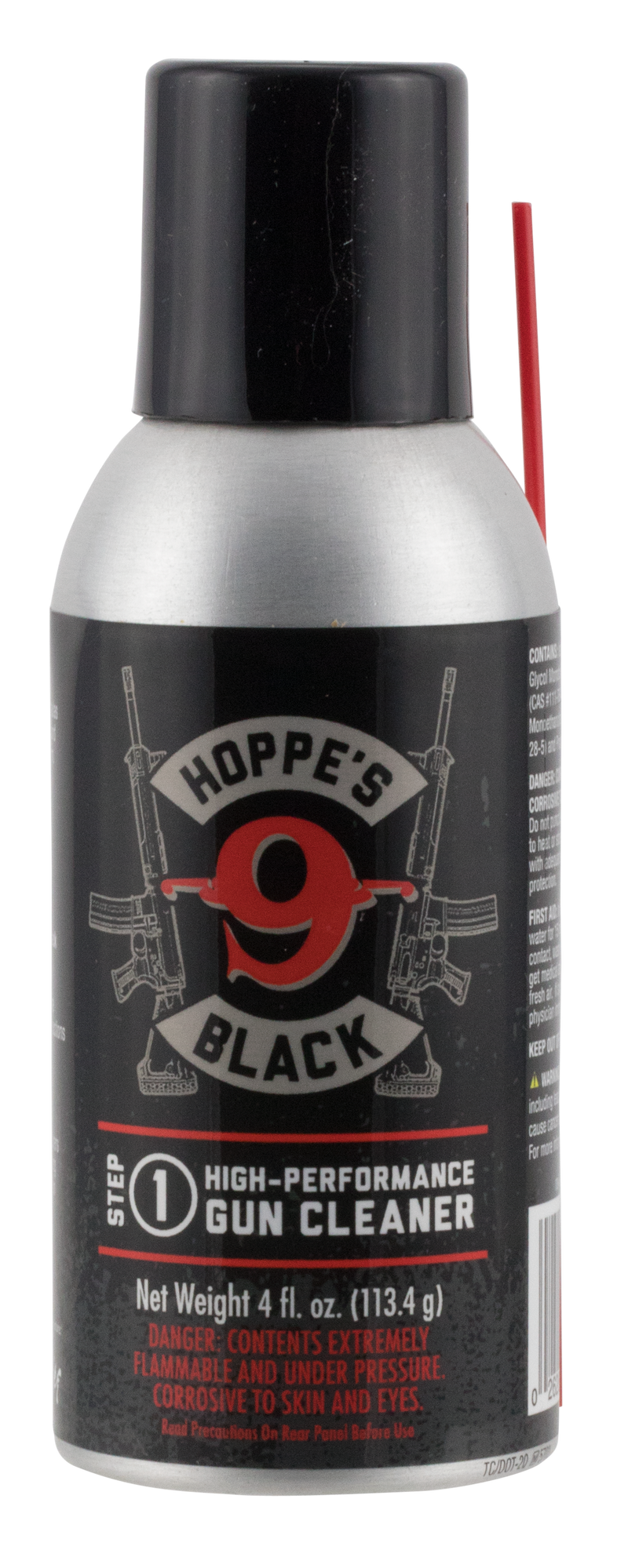 Hoppe's Black Gun Cleaner is a 4 oz aerosol formula engineered to remove high carbon levels, oil, grease, and dirt from firearms. The product includes an extension tube for precise application and is safe to use on any firearm bore. This solvent delivers superior cleaning performance in a convenient aerosol can.