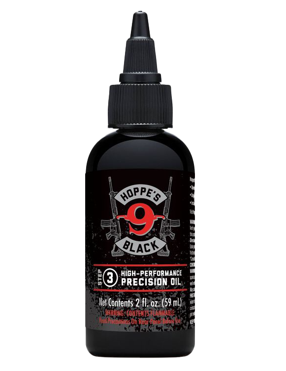 Hoppe's Black Precision Oil is formulated to manage high heat conditions created during high round count shooting, with an extreme temperature range from -65°F to 540°F. The oil includes rust inhibitors and comes in a 2 oz squeeze bottle with a precision tip applicator for easy application. This product is suitable for firearm maintenance and protection.