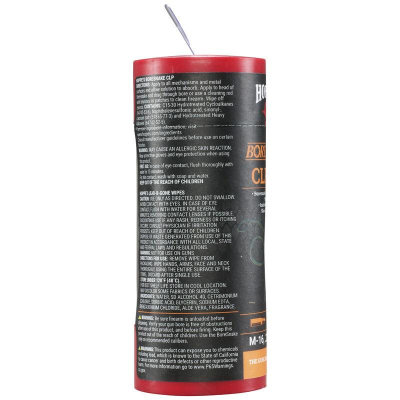 Complete barrel cleaning kit designed for 5.56mm/.223 caliber rifles, featuring Hoppe's Original Boresnake, 2 oz bottle of Boresnake CLP, and Lead-B-Gone wipes for field or range use. The reusable canister package makes it portable and convenient for grab-and-go cleaning. Includes all essential components for quick barrel maintenance without requiring disassembly.