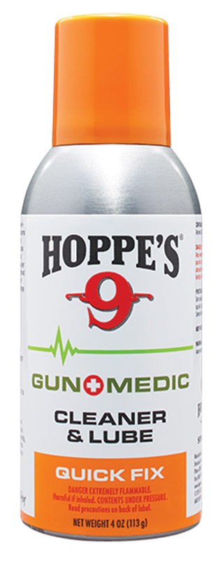 Hoppe's Gun Medic is an all-in-one cleaner and lubricant that cleans firearm actions and leaves behind a thin protective layer of high-performance lubrication. The formula evaporates in 60 seconds and resists temperatures from -65°F to 500°F, utilizing bio-based technology. It protects against corrosion and is suitable for quick cleaning without requiring a deep clean.