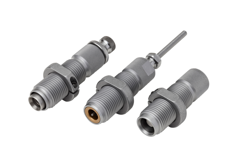 This Hornady Custom Grade Series II 3-die set for .45 ACP includes a full-length sizer die with titanium ring, a seater die with integrated taper crimp, and a pistol-style expander die. Designed for reloading pistol ammunition, it combines sizing, expanding, and crimping functionality in one compact set. The dies are constructed from steel and are part of Hornady's Custom Grade line of precision reloading tools.